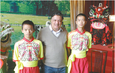 图为纳赛尔·阿卜杜·阿勒(中)与中国舞狮队少年合影。