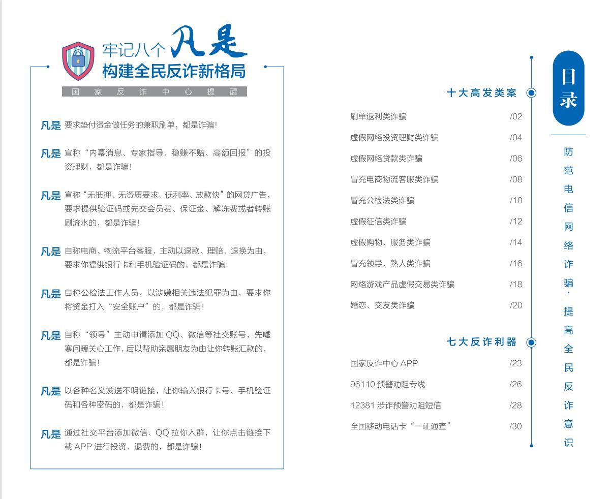2023-12-01 人民网北京电 (记者郝萍、梁秋坪)按照中央宣传部、公安部联合部署开展的“全民反诈在行动”集中宣传月活动有关要求,国家反诈中心编写制作并最新推出《2023版防范电信网络诈骗宣传手册》(以下简称《手册》),详细梳理10类高发电信网络诈骗案件特点和诈骗手法,深入介绍7大反诈利器的主要功能和使用方法,进一步扩大反诈宣传覆盖面,提升广大群众识骗防骗意识和能力。 针对当前电信网络诈骗犯罪形势特点,《手册》详细介绍了刷单返利、虚假网络投资理财、虚假网络贷款、冒充电商物流客服、冒充公检法、虚假征信、虚假购物服务、冒充领导熟人、网络游戏产品虚假交易、婚恋交友等10种常见的高发电信网络诈骗类型,剖析了典型案例,揭露了诈骗手法,为易受骗群体“量身定制”反诈防骗提示。 聚焦“关口前移、预防为先”,《手册》详细介绍了过去两年里,公安部会同工信部、中国人民银行联合推出的七大反诈利器——国家反诈中心APP、96110预警劝阻专线、12381涉诈预警劝阻短信系统、全国移动电话卡“一证通查”、云闪付APP“一键查卡”、反诈名片、全国互联网账号“一证通查2.0”的主要功能和下载查询方法,鼓励广大群众多下载多使用,共同构筑拦截电信网络诈骗的“防火墙”。 公安机关提醒广大群众: 凡是要求垫付资金做任务的兼职刷单,都是诈骗!凡是宣传“内幕消息、稳赚不赔、高额回报”的投资理财,都是诈骗! 凡是宣称“无抵押、无资质要求、低利率、放款快”的网贷广告,要求提供验证码或先交“会员费”“保证金”“解冻费”或者转账刷流水的,都是诈骗! 凡是自称电商、物流平台客服,主动以退款、理赔、退换为由,要求提供银行卡和手机验证码的,都是诈骗! 凡是自称公检法工作人员,以涉嫌相关违法犯罪为由,要求将资金打入“安全账户”的,都是诈骗 凡是自称“领导”主动申请添加QQ、微信等社交账号,先嘘寒问暖关心工作,后以帮助亲属朋友为由让转账汇款的,都是诈骗! 凡是以各种名义发送不明链接,让你输入银行卡号、手机验证码和各种密码的,都是诈骗! 凡是通过社交平台添加微信、QQ拉你入群,让你点击链接、下载APP进行投资、退费的,都是诈骗!国家反诈中心推出《2023版防范电信网络诈骗宣传手册》