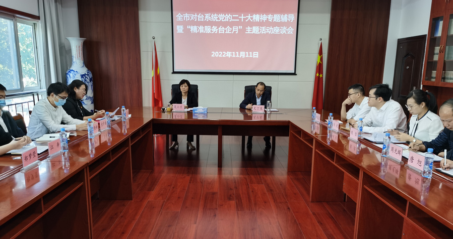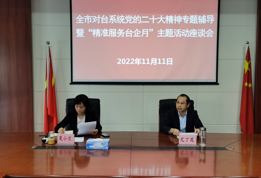 全市对台系统“精准服务台企月”主题活动座谈会召开 全面学习贯彻党的二十大精神 2022-11-12 为深入贯彻新时代党解决台湾问题的总体方略,全面学习宣传贯彻党的二十大精神,扎实推进我市涉台服务保障工作,持续优化涉台营商环境,11月11日,全市对台系统“精准服务台企月”主题活动座谈会在市委台办会议室召开,市委台办主任夏小兰出席并作党的二十大精神宣讲,市委台办四级调研员尤丁发主持,各县区台办主任、开发区(综保区、湾里局)对台工作负责人参加。 夏小兰以“奋进新时代新征程、推进对台事业新发展”为题,从“坚持学习领会,深刻把握党的二十大报告精神实质;坚持聚焦主业,贯彻新时代党解决台湾问题总体方略;坚持知行合一,大力推进台办系统各项工作创新发展”三个方面对党的二十大精神进行了宣讲。她指出,党的二十大报告思想深邃、博大精深、气势恢宏、引领时代、催人奋进,全面贯彻落实党的二十大精神的前提,关键是深入学习领会好党的二十大报告。要在深学深悟中吃透精神、在深入研讨中把握精髓、在交流互动中凝聚共识,通过反复学、持续学、深入学,不断取得新进步、新提高、新收获,以实际行动忠诚拥护“两个确立”,坚决做到“两个维护”。 夏小兰表示,各地精心组织开展了“精准服务台企月”主题活动,实施效果不错,但由于资源禀赋不一样,各地在活动开展中也存在不平衡的情况。这就需要对台工作部门主动作为。加强统筹谋划,多争取领导重视,特别是自身积极主动开展工作,发扬钉钉子精神,全面做到对台资企业情况要清、底数要明,在对接服务上要勤,服务要实实在在。要与台商交朋友,把台商当亲人,这样才有利于我们捕捉项目信息,推进对台招商。每个干部对南昌市的发展都有责任,大家要提高政治站位,认真地做好工作,为祖国统一大业作出应有的贡献。 各县区台办主任、开发区(综保区、湾里局)对台工作负责人从帮助台胞台企解决困难问题、意向项目跟踪对接情况、前两年签约项目落地服务等方面,全面汇报了辖区“精准服务台企月”主题活动开展情况。在听取汇报中,夏小兰一边记一边问,仔细询问各地开展“精准服务台企月”主题活动的特色经验、亮点工作,指导大家加强学习交流,认真吸取经验,不断在学习贯彻党的二十大精神中,推进对台事业取得新发展。(南昌市台办 毛海军)
